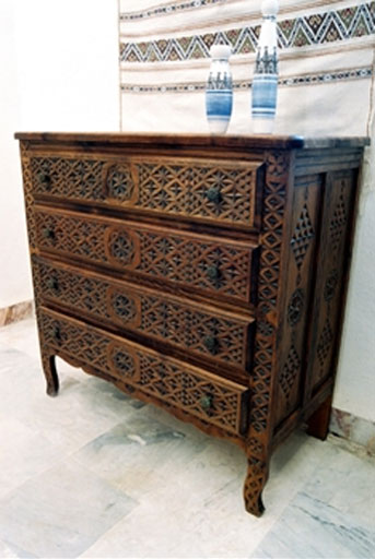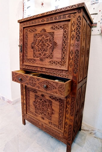 Le bois sculpté s’est développé avec un cachet typiquement local (Tlemcen, et kabylie). Les canapés, bureaux, tables, chaises, coffres, miroirs, etc ...) seront des produits d’un artisanat traditionnel algérien.